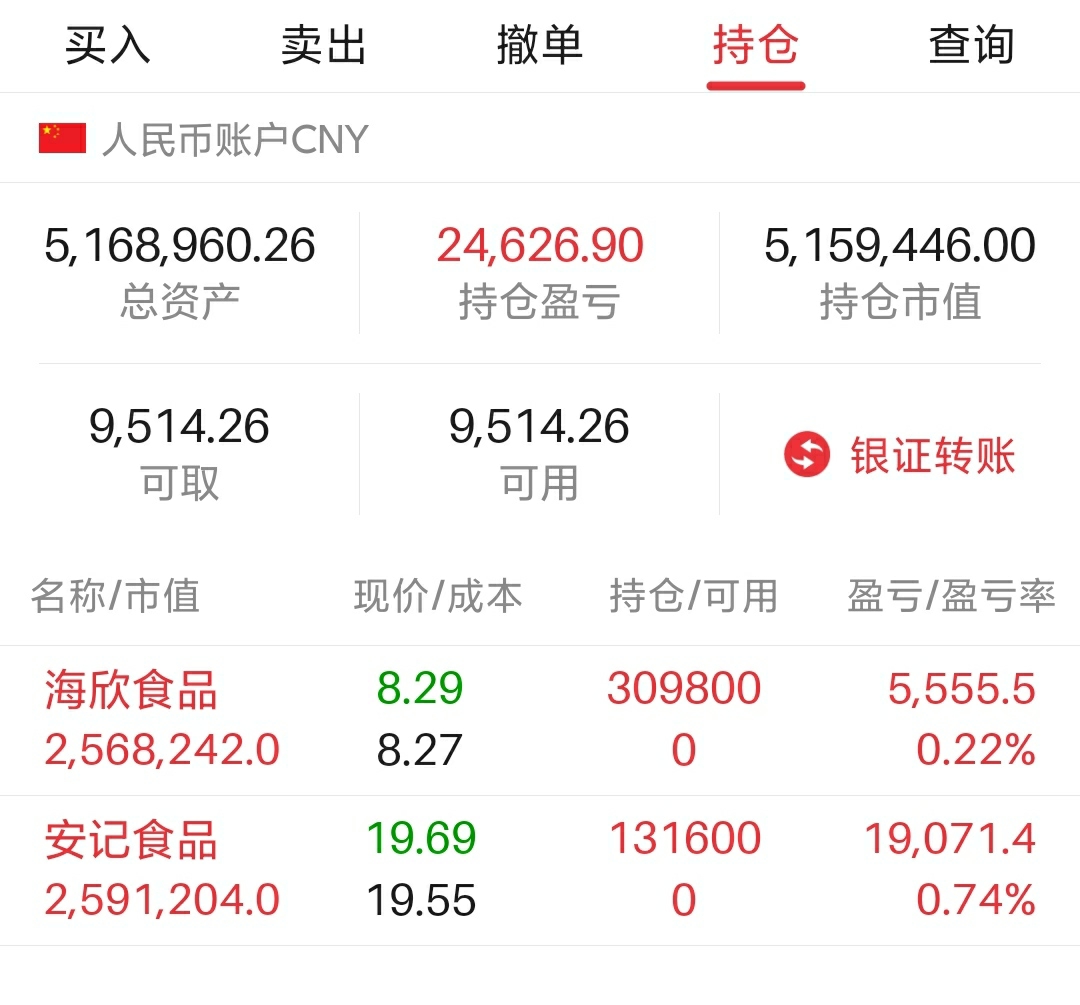 $海欣食品(SZ002702)$ $安记食品(SH603696)$ 各半仓介入安记食品和海欣食品了!大家看看我的交割单,进来讨论一下后市操作!