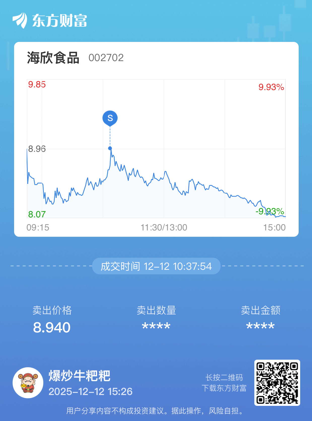 $海欣食品(SZ002702)$ 昨天抄底博今天反弹的,但是没有力度,亏了手续费走了兄弟们。我今天也是亏
