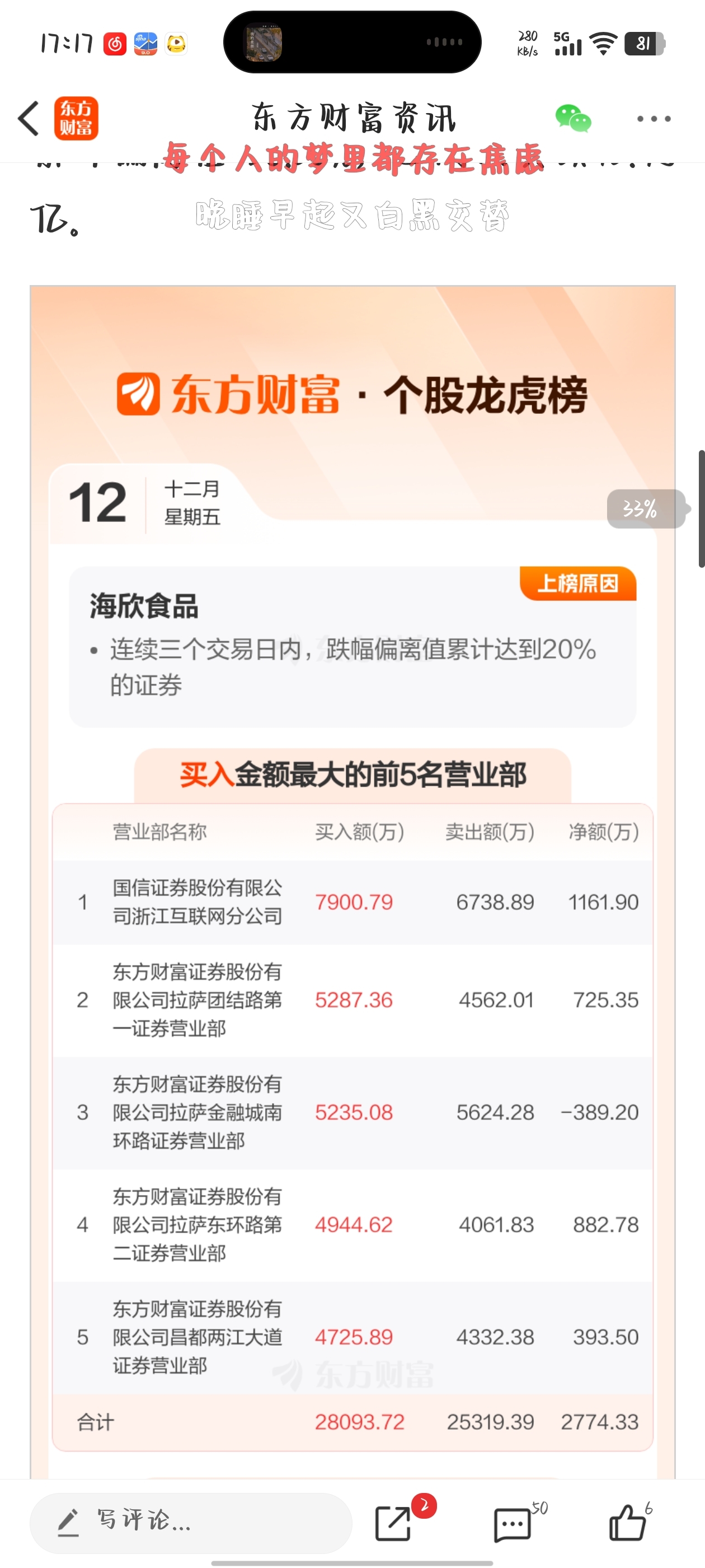 $海欣食品(SZ002702)$ 龙虎榜买方五个散户?昨天龙虎榜好几个散户今天跌停,今天五个散户,周一又要闷杀了!快跑!
