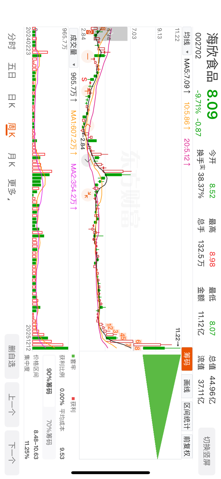 $海欣食品(SZ002702)$ 卧槽,周线没有获利盘了!这特么玩个锤子