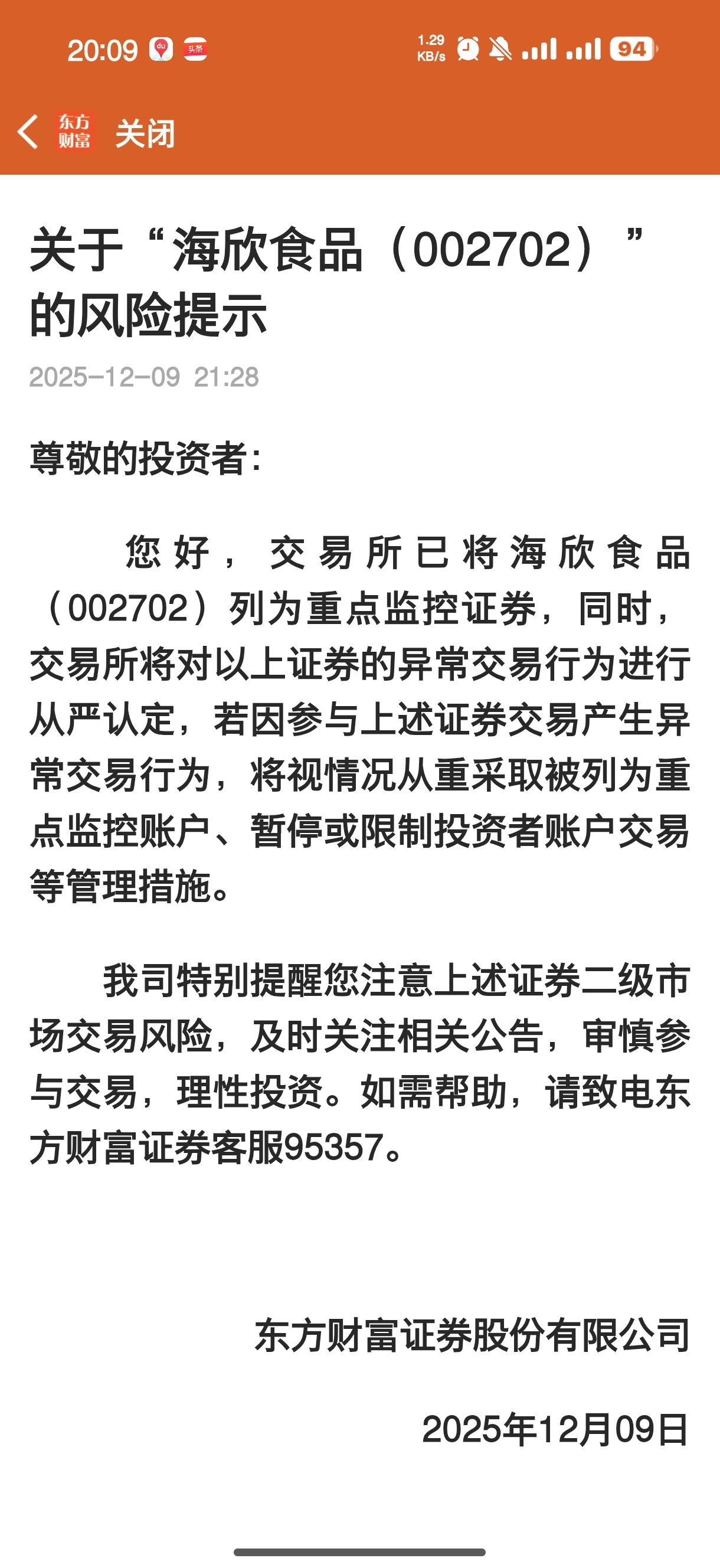 $海欣食品(SZ002702)$ 请各位韭菜,带着脑子看这条公告。。尤其是智商59分以下的。重点监控的还想的大涨