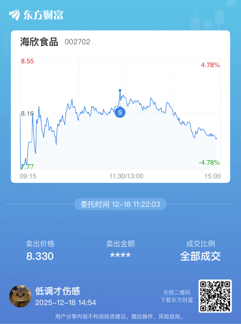 $海欣食品(SZ002702)$ 等跌到7元,我还会再回来的 哈哈!