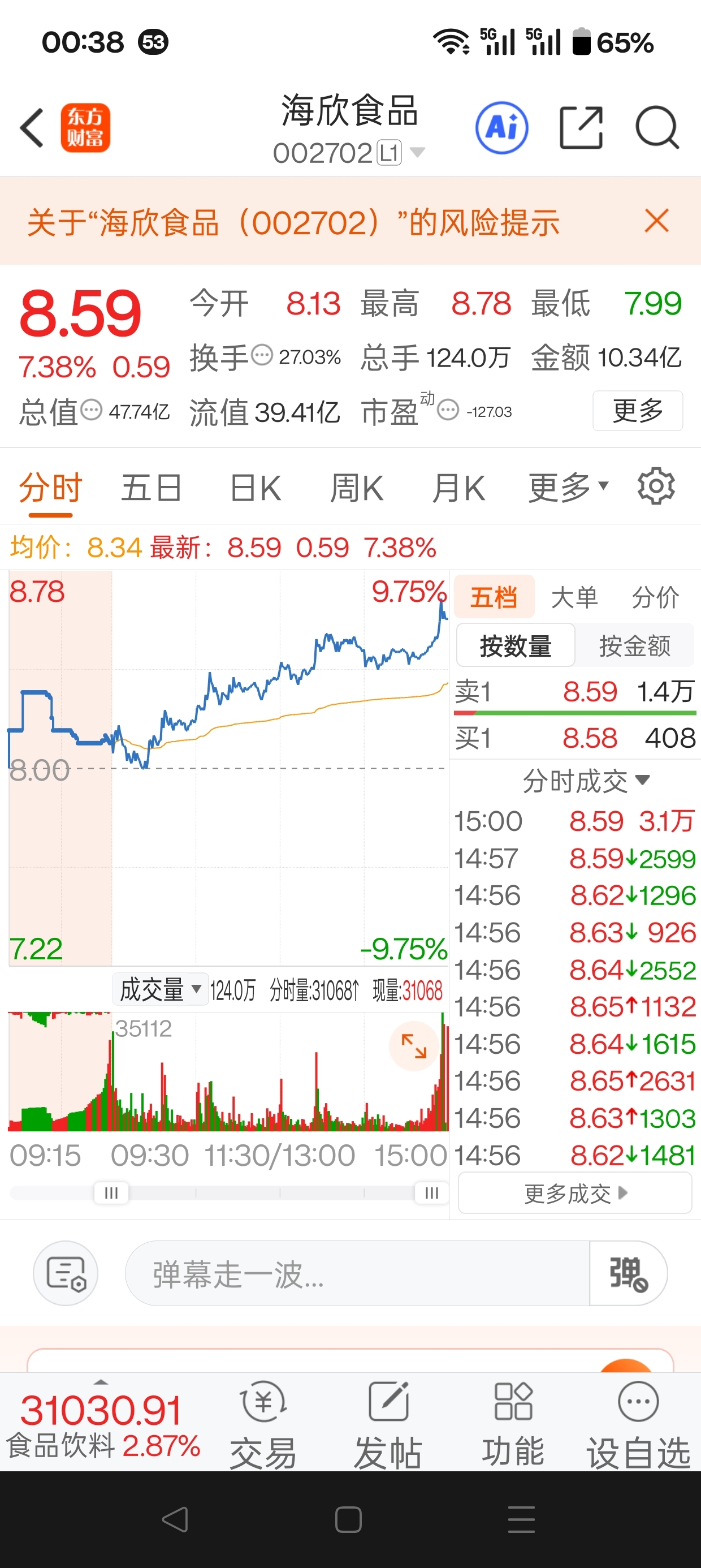$海欣食品(SZ002702)$ 为啥周五尾市8.59不卖出?周一一个低开下蹲,你一买,成本就降低了。这就是著名的尾市卖出战法。收盘价,在绝大多数情况下都不是次日最低价。你坚持做一个月,二十天,你的成本也会降低百分之二十。当然了,你必须手里有等量的现金,才可以做到降低百分之二十成本的效果。因为我们是次日回转交易。