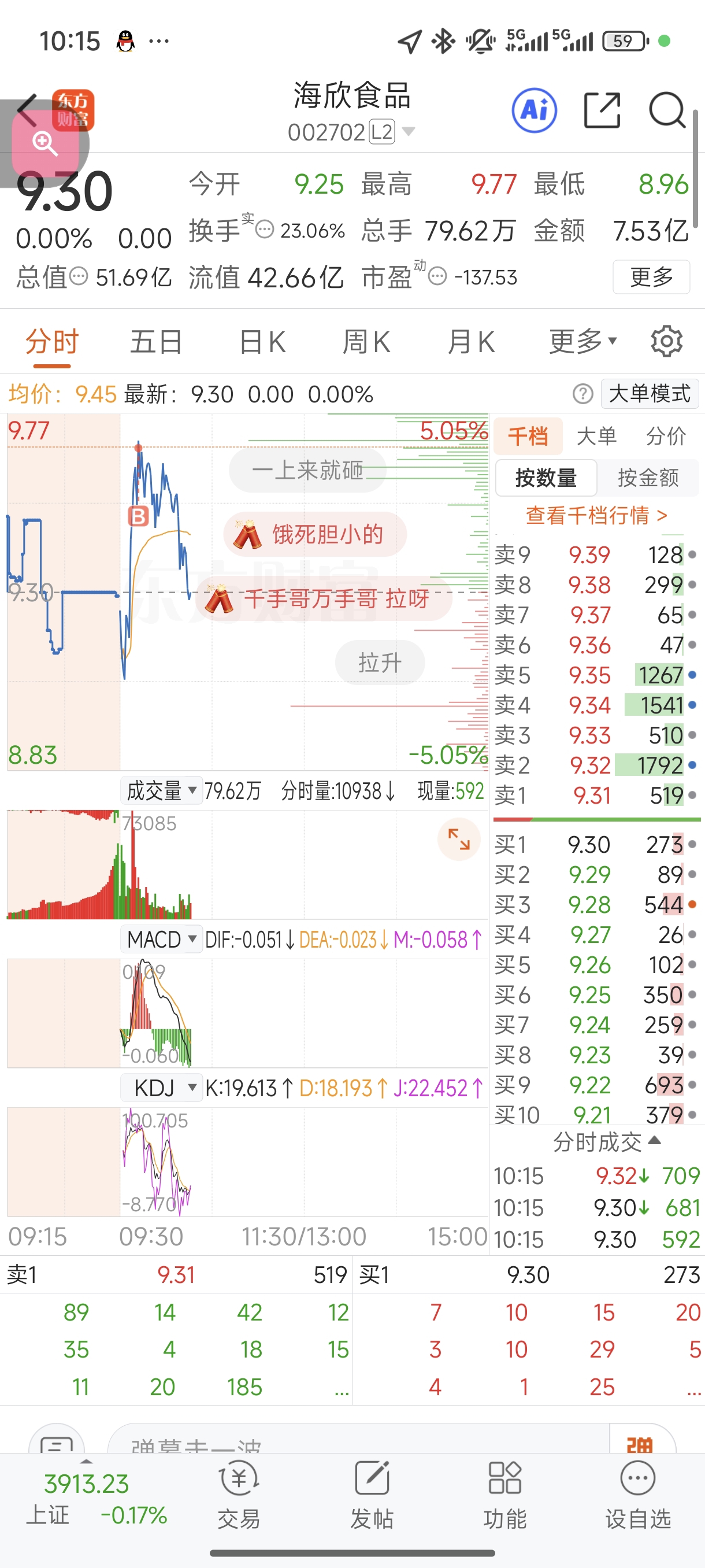 $海欣食品(SZ002702)$ 试个水,买到山顶了