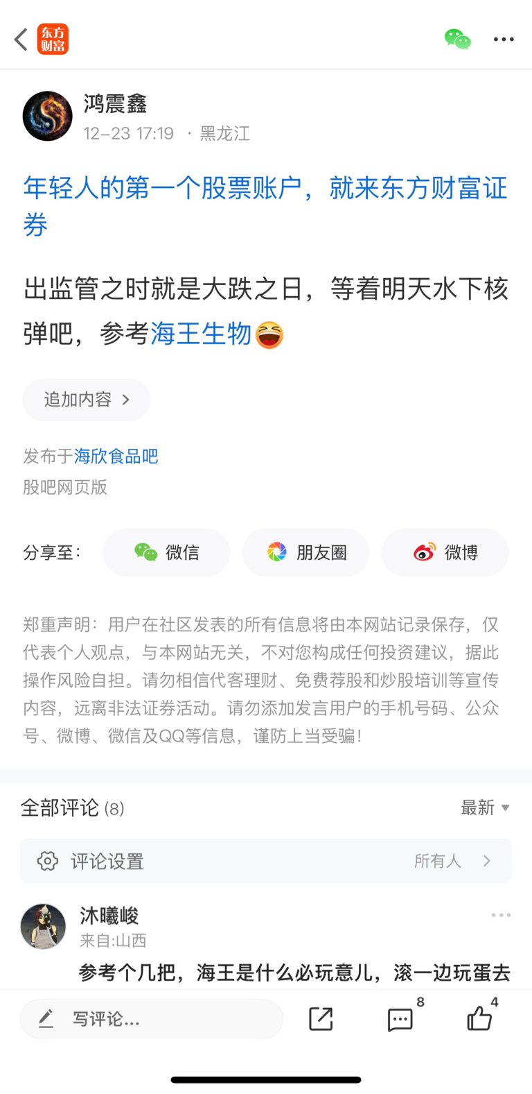 温馨提示: 1.根据《证券法》规定,禁止编造、传播虚假信息或者误导性信息,扰乱证券市场;2.用户在本社区发表的所有资料、言论等仅代表个人观点,与本网站立场无关,不对您构成任何投资建议。用户应基于自己的独立判断,自行决定证券投资并承担相应风险。《东方财富社区管理规定》