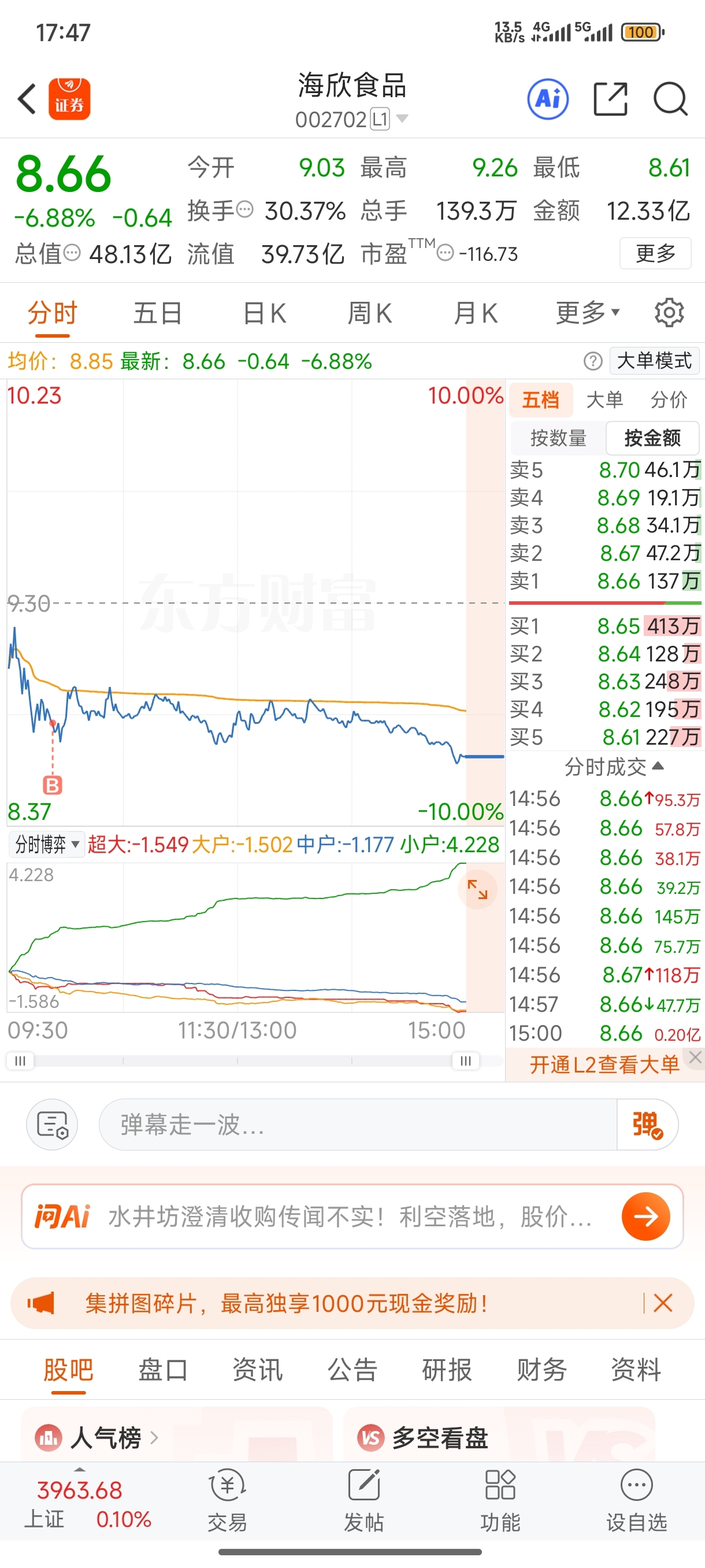 $海欣食品(SZ002702)$ 我也是服了你们 昨天进了5层 今天加仓两层