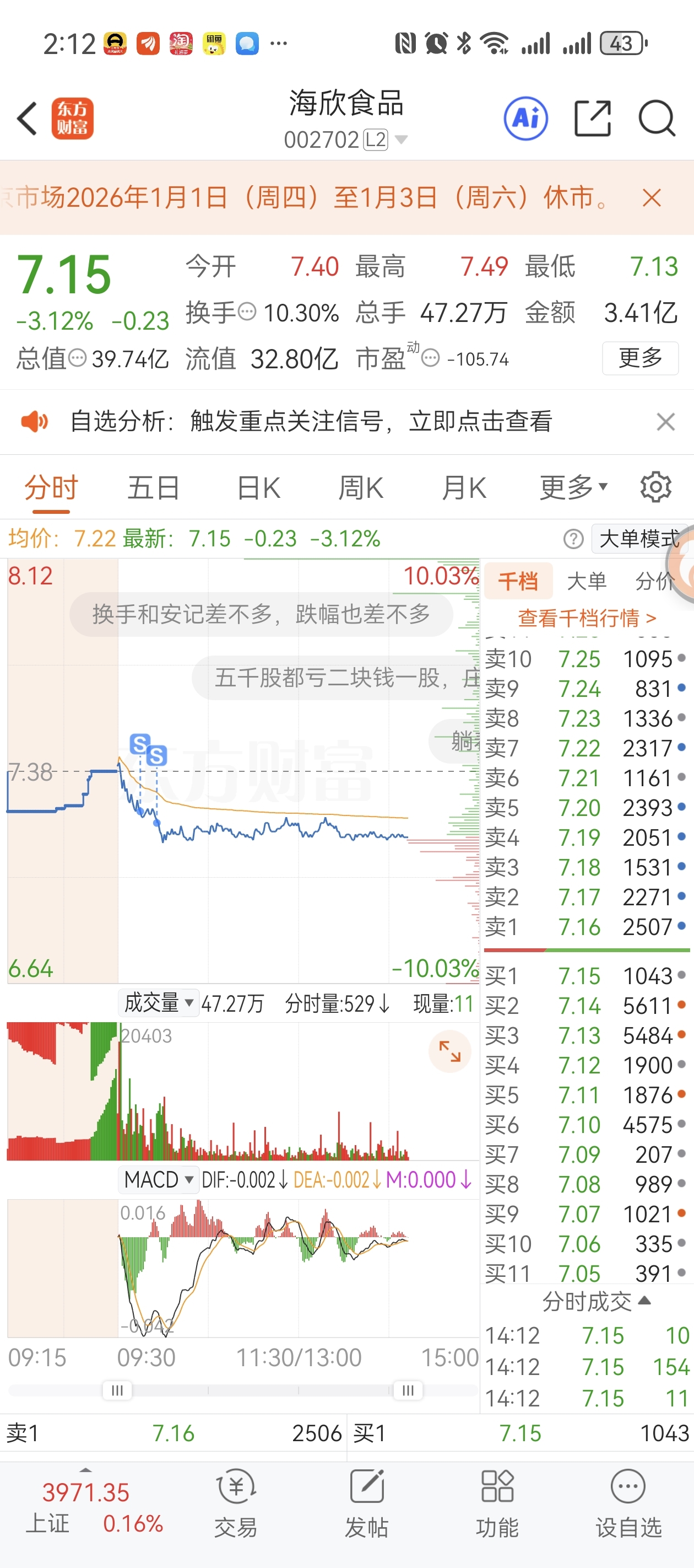 $海欣食品(SZ002702)$ 套我15个点,走了