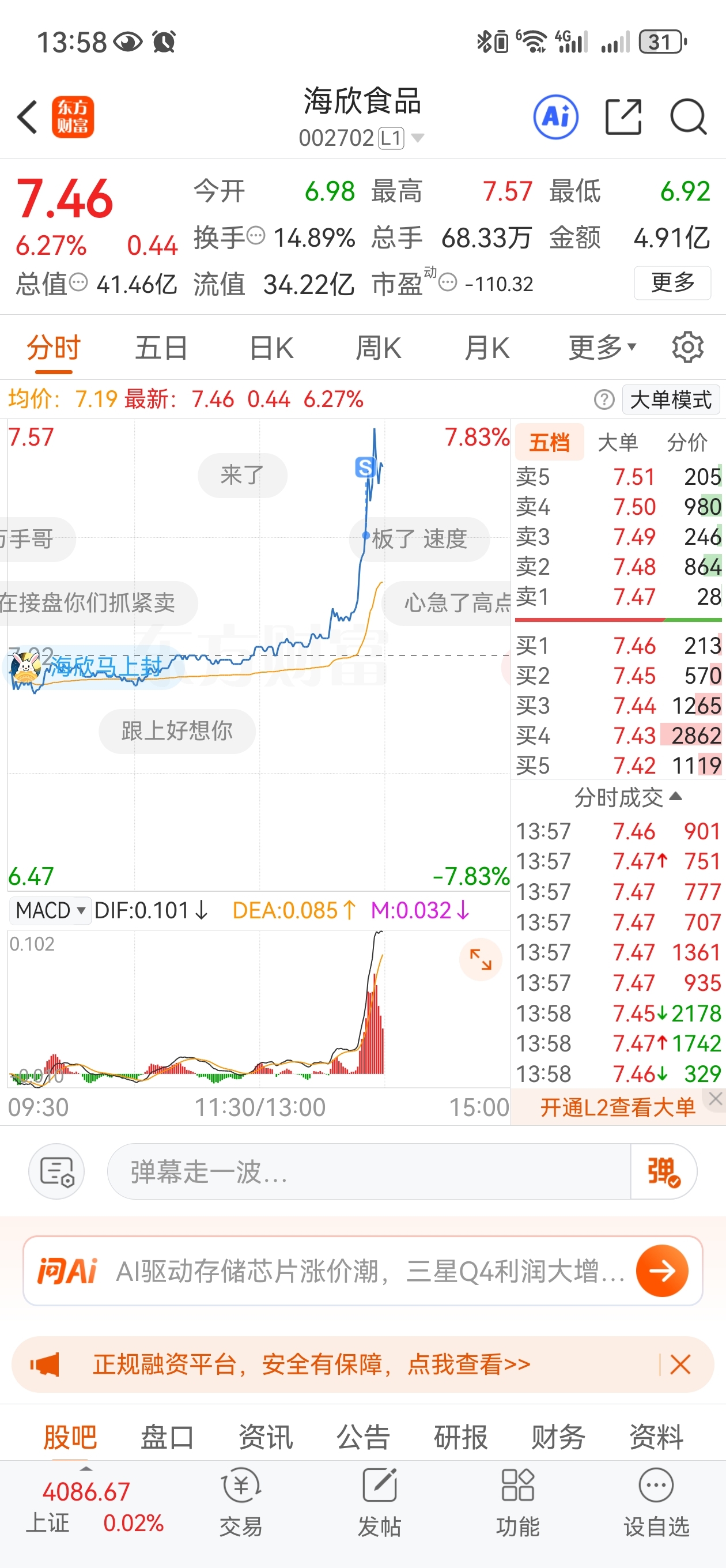 $海欣食品(SZ002702)$ 设置的卖飞了。。