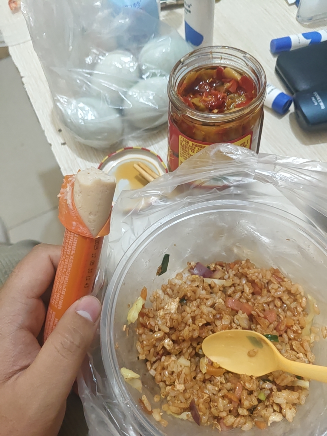 今天好开心,晚上特意买了四个咸鸭蛋,跟一瓶咸菜,还有一根火腿肠