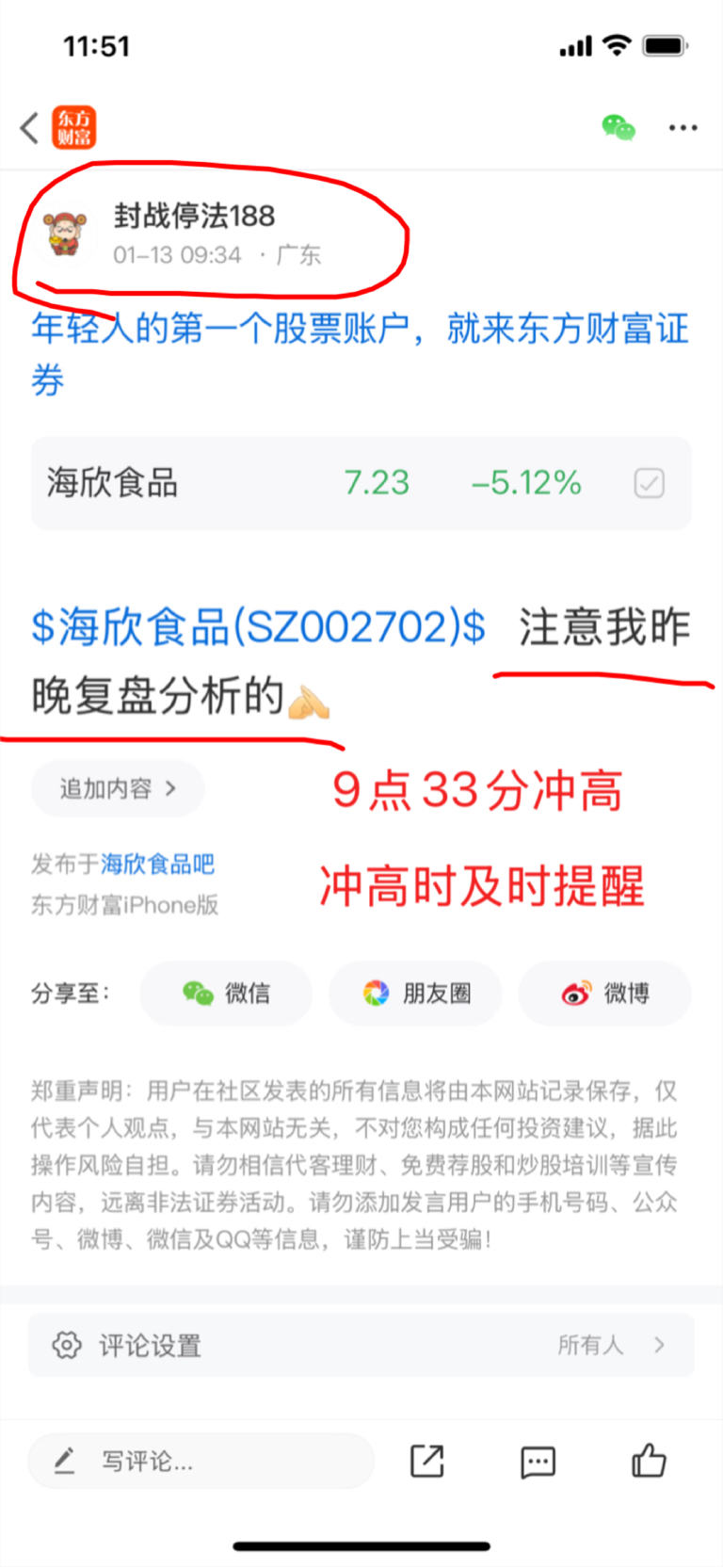 $海欣食品(SZ002702)$ 小海欣由于昨天我加仓没做T,仓位大故开盘冲高通过盘面观察到它再回落就挂7.68清仓了,盘中我也发帖提醒,早盘量能明显放大,制造恐慌的感觉很大,故下午看情况再买回,股市有风险,投资需谨慎