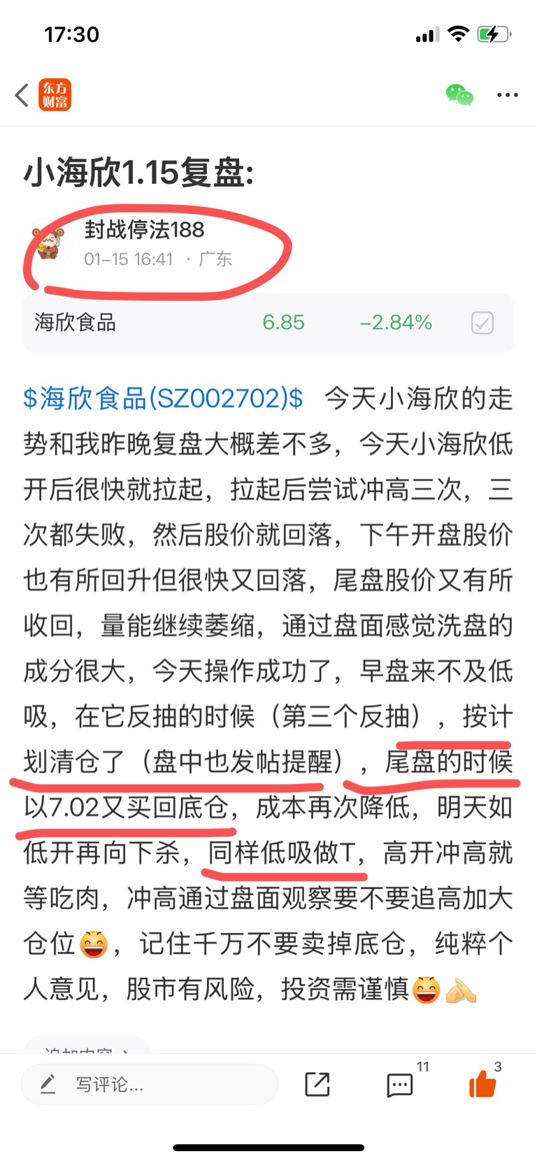 $海欣食品(SZ002702)$ 今天小海欣量能比昨天稍微放大一点,早盘平开,开盘股价往下走,下午股价又有所回升,今天没机会做T,利润回吐两个多点,下星期有机会继续做T,如股价下跌到6.38这个支撑点,就加大仓位,下星期应该会有个反抽,如反抽做T,继续保留底仓,股市有风险,投资需谨慎