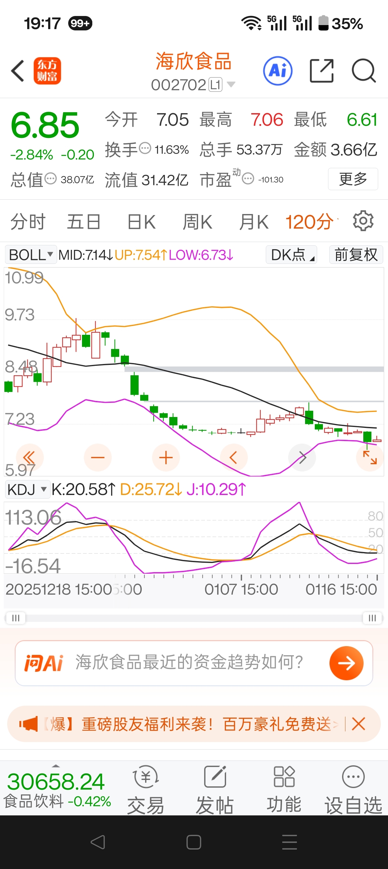 $海欣食品(SZ002702)$ 半日线。跌到位了,摸到了下轨线kdj翘头往上。周一反弹。