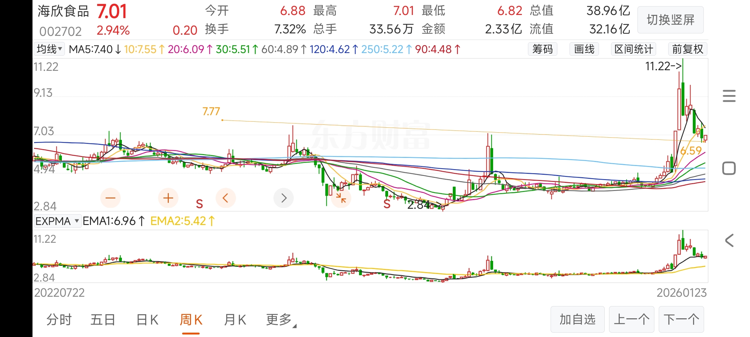 $海欣食品(SZ002702)$ 网上有人天天喊海欣食品,周线复合头肩底突破颈线回踩颈线,日线没有放量阳线不能确定支撑是否有效,均线呈空头排列,没有量能配合,看看下周如果有放量阳线后期关注,没有的话,纯属臆想,看不到任何迹象反转