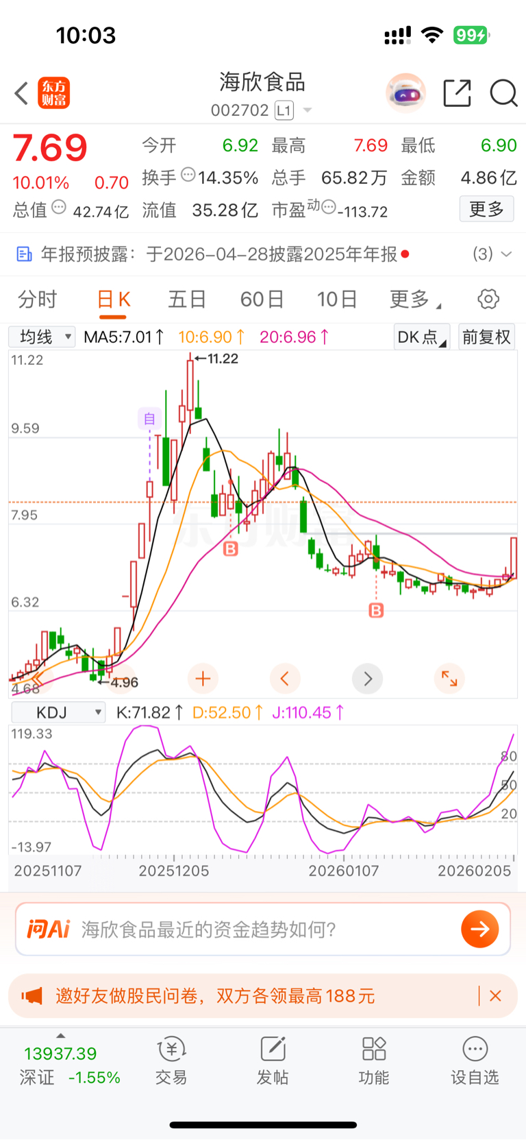 $海欣食品(SZ002702)$ 挂了这么久了还差一个板才回本,鱼丸你害的我好苦啊