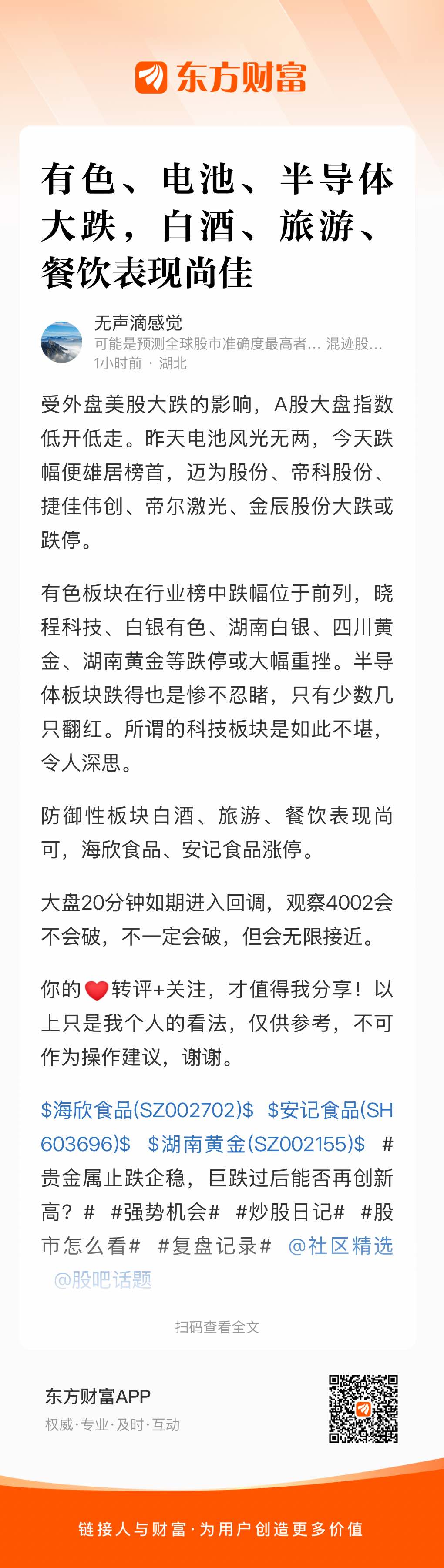 $海欣食品(SZ002702)$ $安记食品(SH603696)$ $湖南黄金(SZ002155)$ #贵金属止跌企稳,巨跌过后能否再创新高?# #强势机会# #炒股日记# #股市怎么看# #复盘记录# @社区精选 @股吧话题
