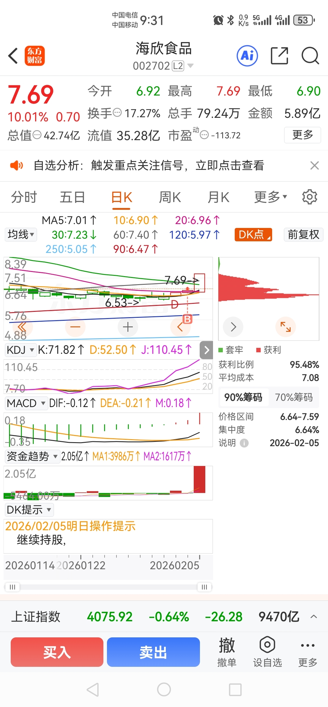 $海欣食品(SZ002702)$ 才一天就 抓到一个涨停