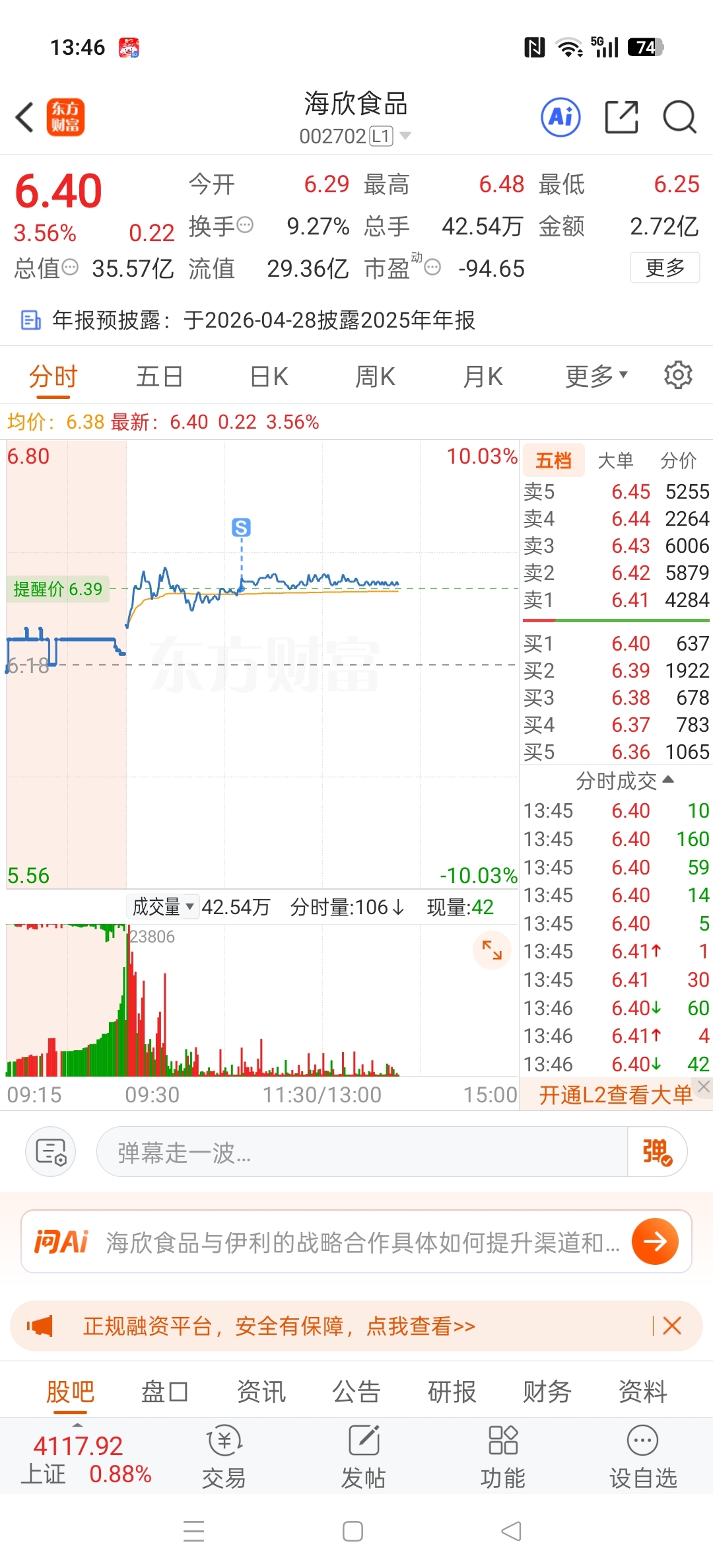 $海欣食品(SZ002702)$ 6.39磨了快一天,完全等量能不愿意高价吃,还是得低吸