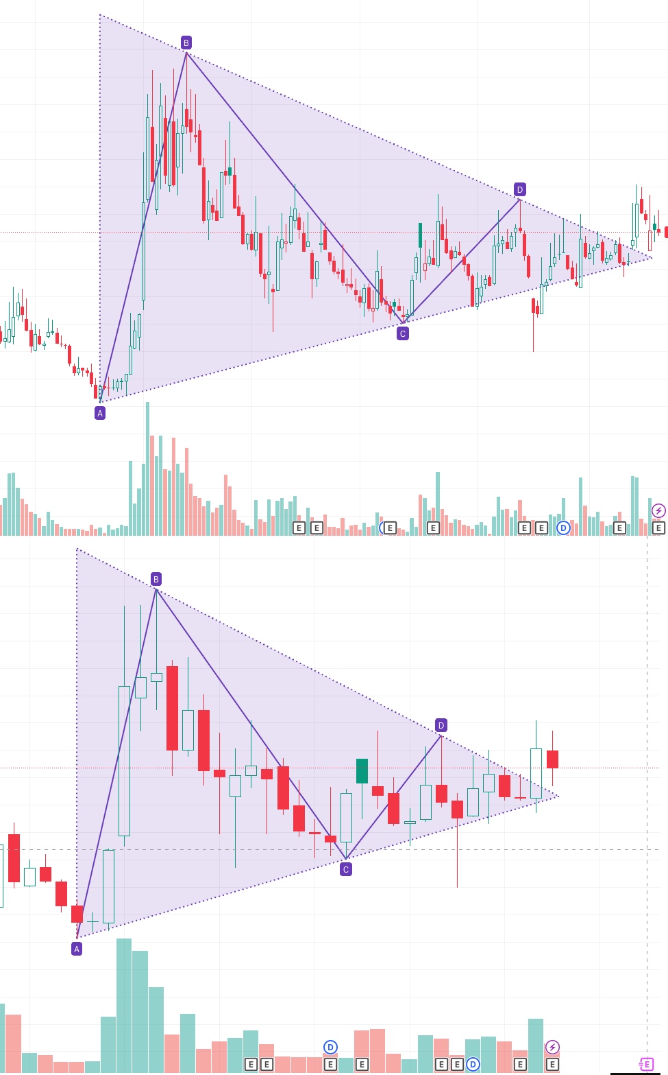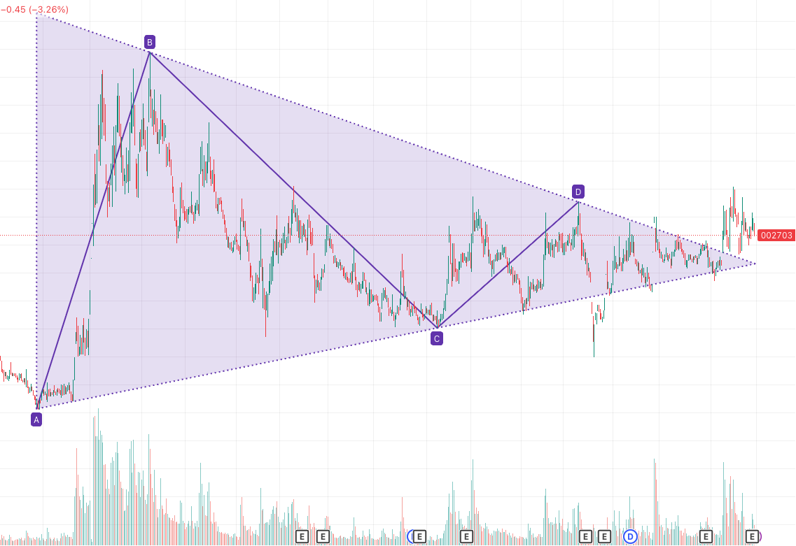 两个不同周期的三角形态2025年4月由于外部原因导致缩量破位。