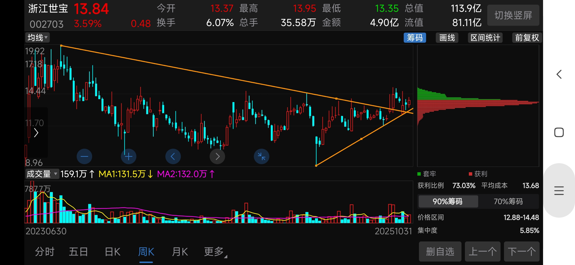 $浙江世宝(SZ002703)$ 世宝周K漂亮。下周突破15.08元逻辑分析:
