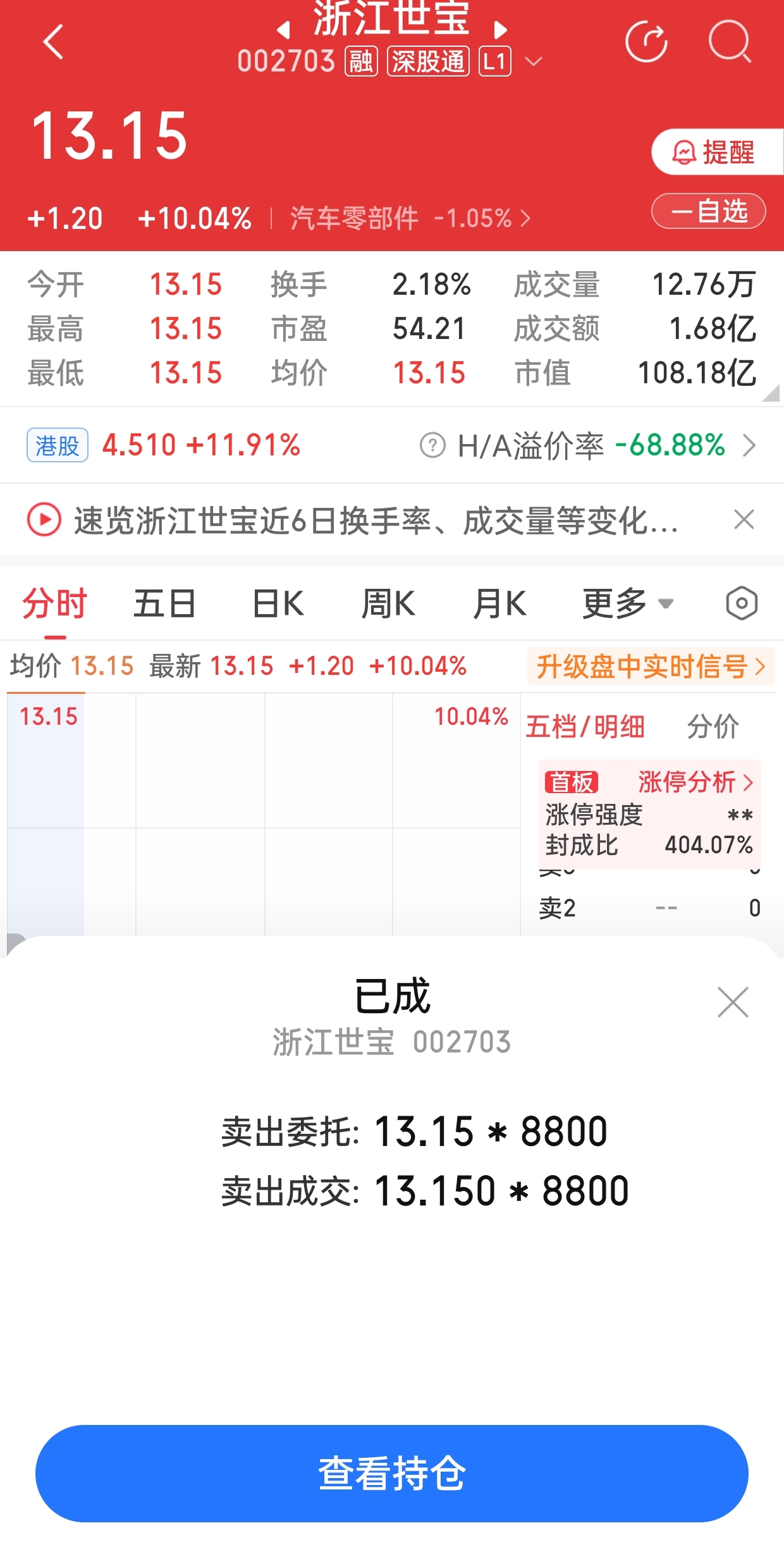 $浙江世宝(SZ002703)$ 先卖个88手试试水,看看主力封不封的住