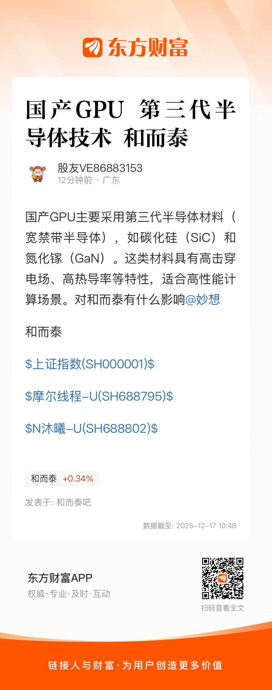 国产GPU主要采用第三代半导体材料(宽禁带半导体),如碳化硅(SiC)和氮化镓(GaN)。这类材料具有高击穿电场、高热导率等特性,适合高性能计算场景。对和而泰有什么影响@妙想