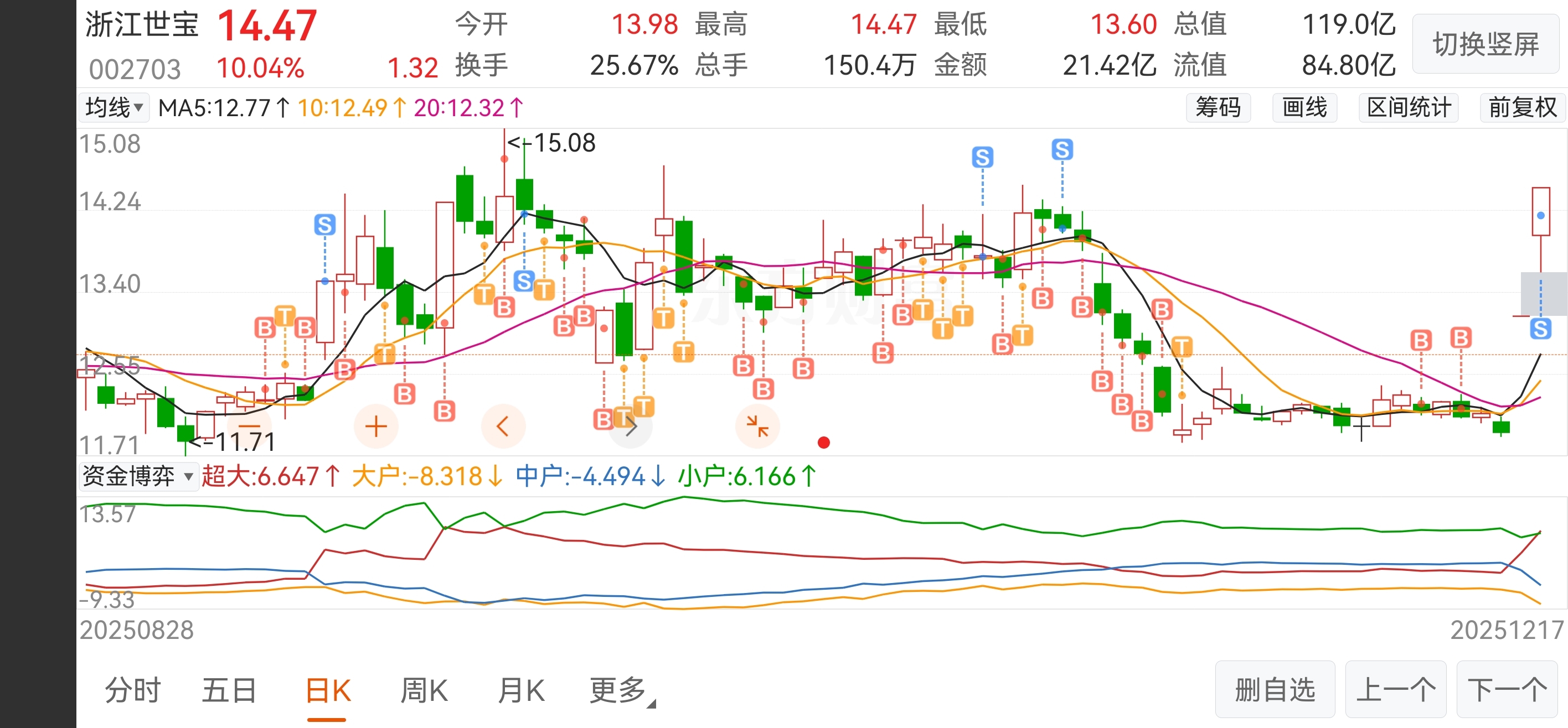 前面的两笔加仓T出去了。。。成本六块钱了最主要的现在的钱全是浙江世宝给赚的相当于