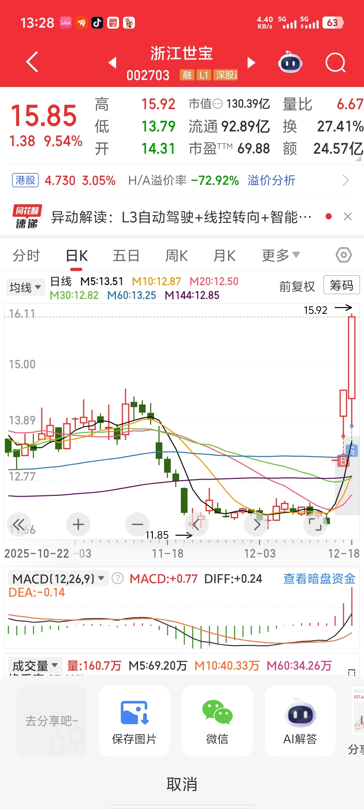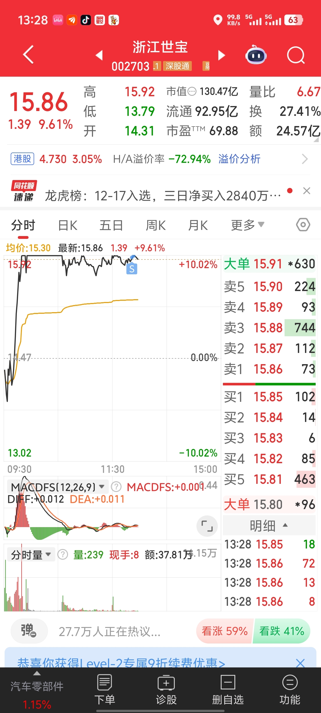 $浙江世宝(SZ002703)$ 不是唱空。个人计划。今天持仓的条件太苛刻,一是百大集团炸板。二是老周期平潭不能上涨。目前来看有些困难。板砸清仓观望吧。明天回来的前提是此股今日回封,明天高开!不过困难又是重重啊。不然就只能祝里面兄弟发财了。