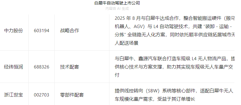 L4级智能驾驶领军企业白犀牛,主要合作上市公司。