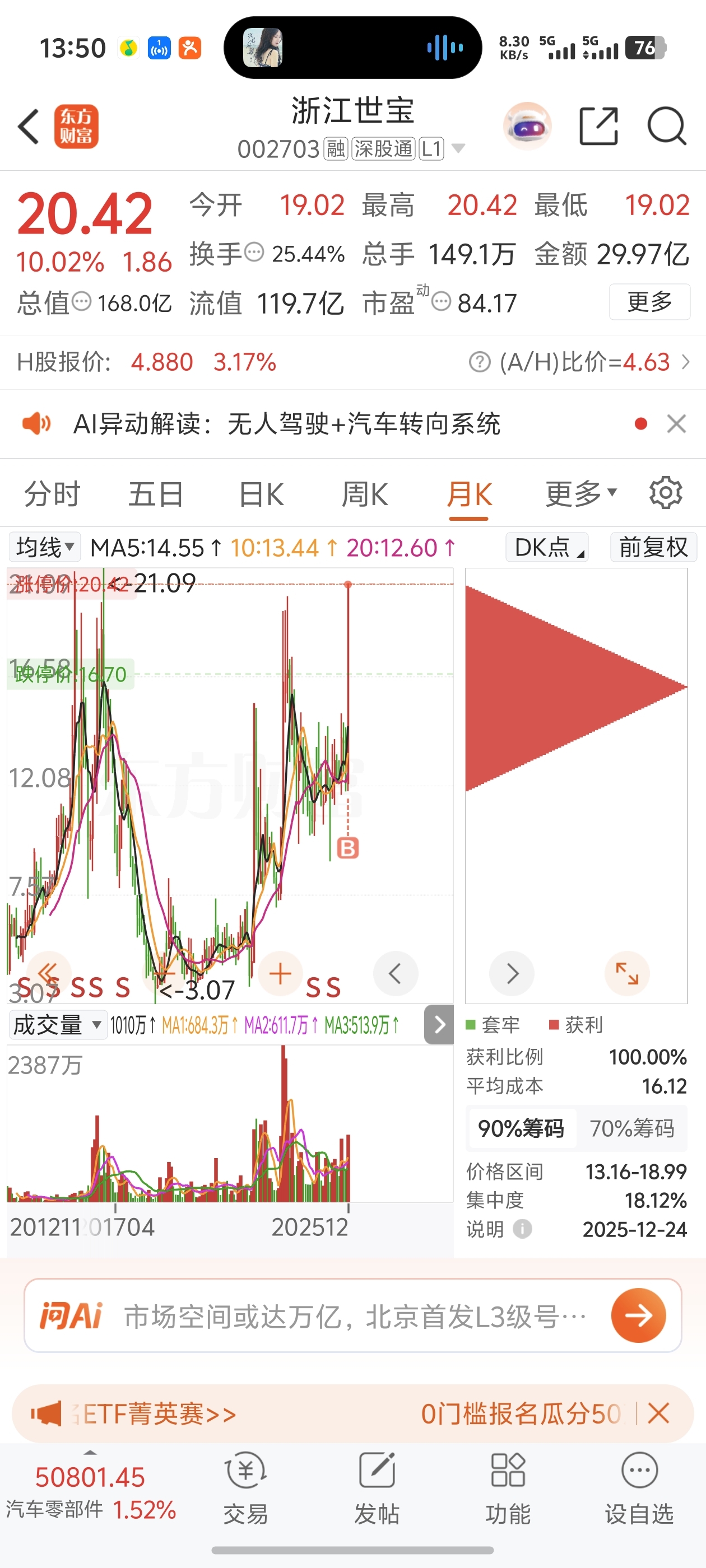 $浙江世宝(SZ002703)$ 早上开盘打板进,中间炸板,明天新高???#炒股日记#