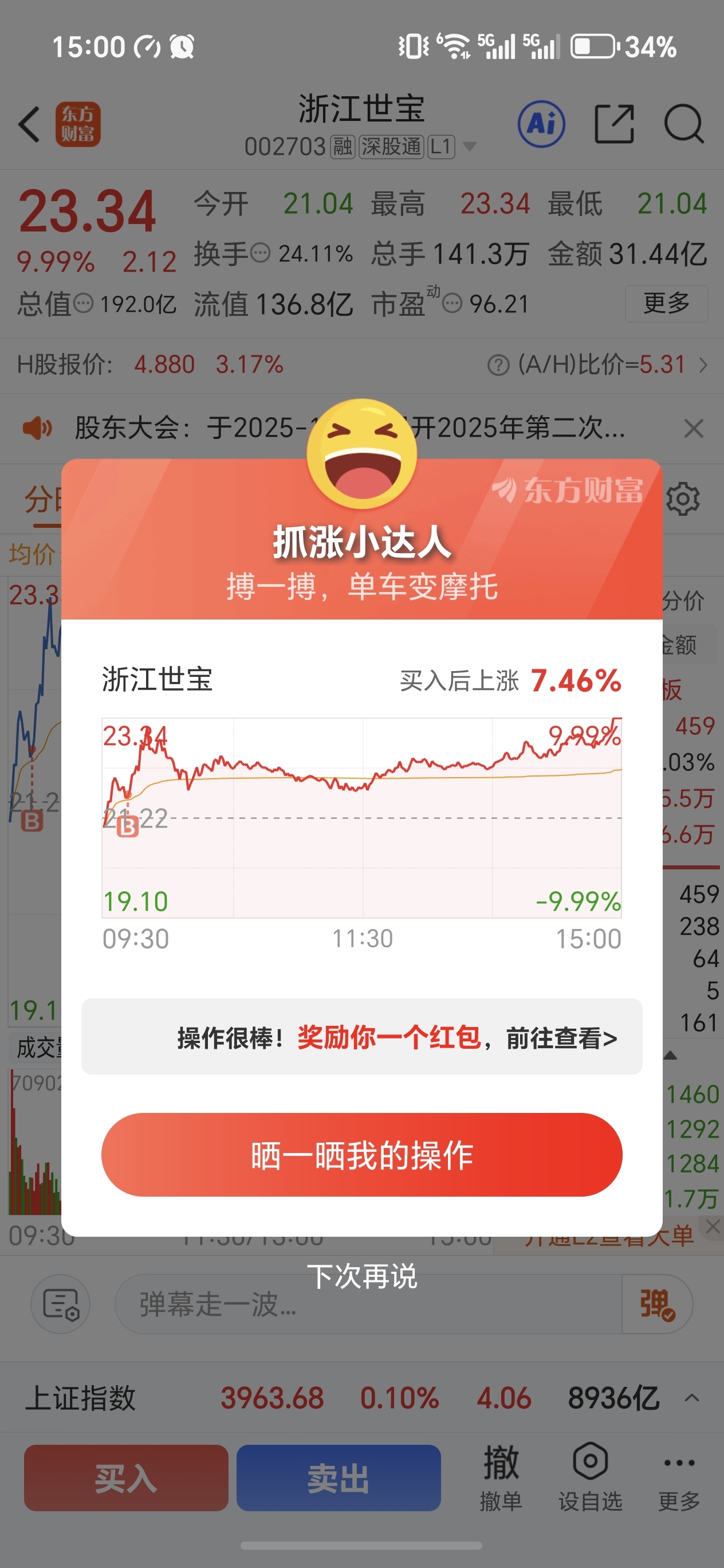 $浙江世宝(SZ002703)$ 买的不多,周一也危险,尾盘拉板
