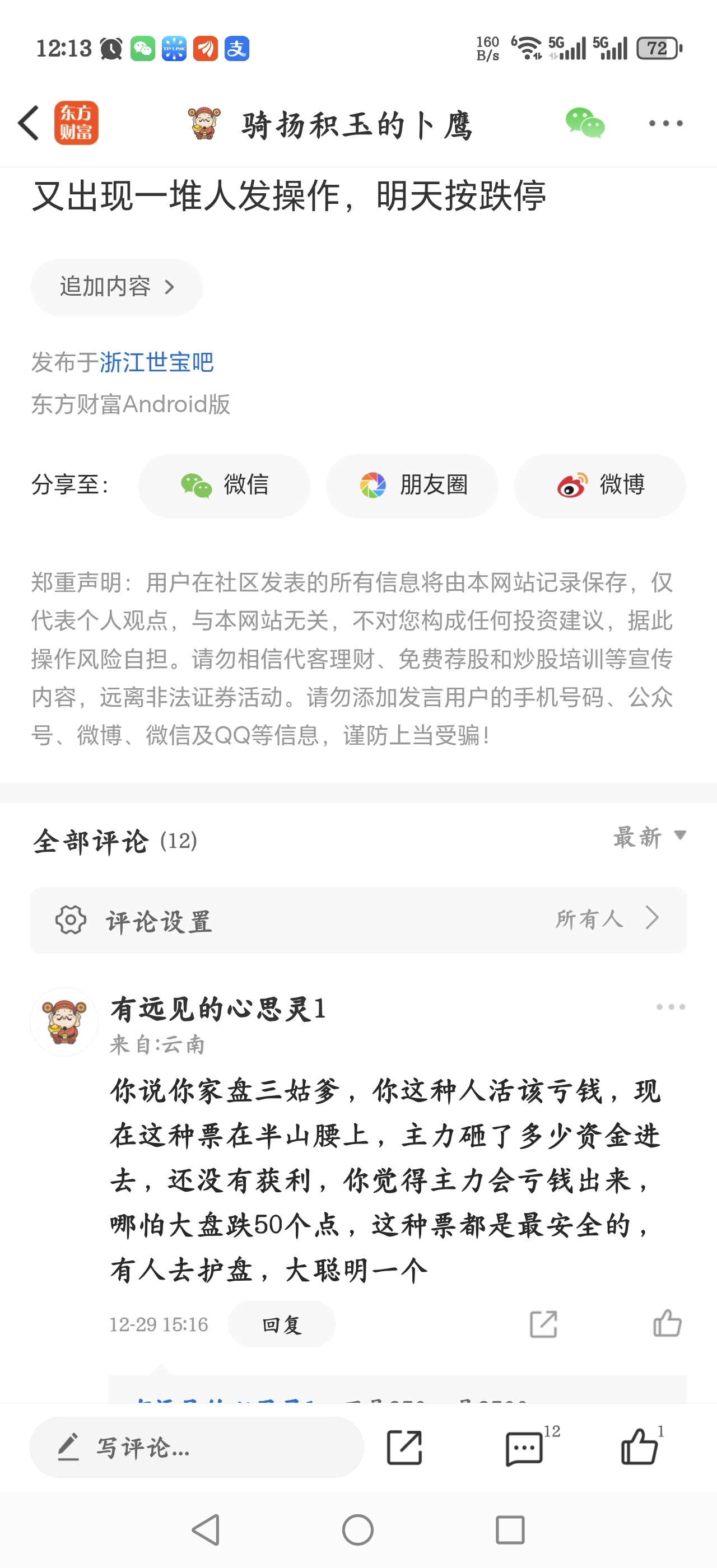 温馨提示: 1.根据《证券法》规定,禁止编造、传播虚假信息或者误导性信息,扰乱证券市场;2.用户在本社区发表的所有资料、言论等仅代表个人观点,与本网站立场无关,不对您构成任何投资建议。用户应基于自己的独立判断,自行决定证券投资并承担相应风险。《东方财富社区管理规定》