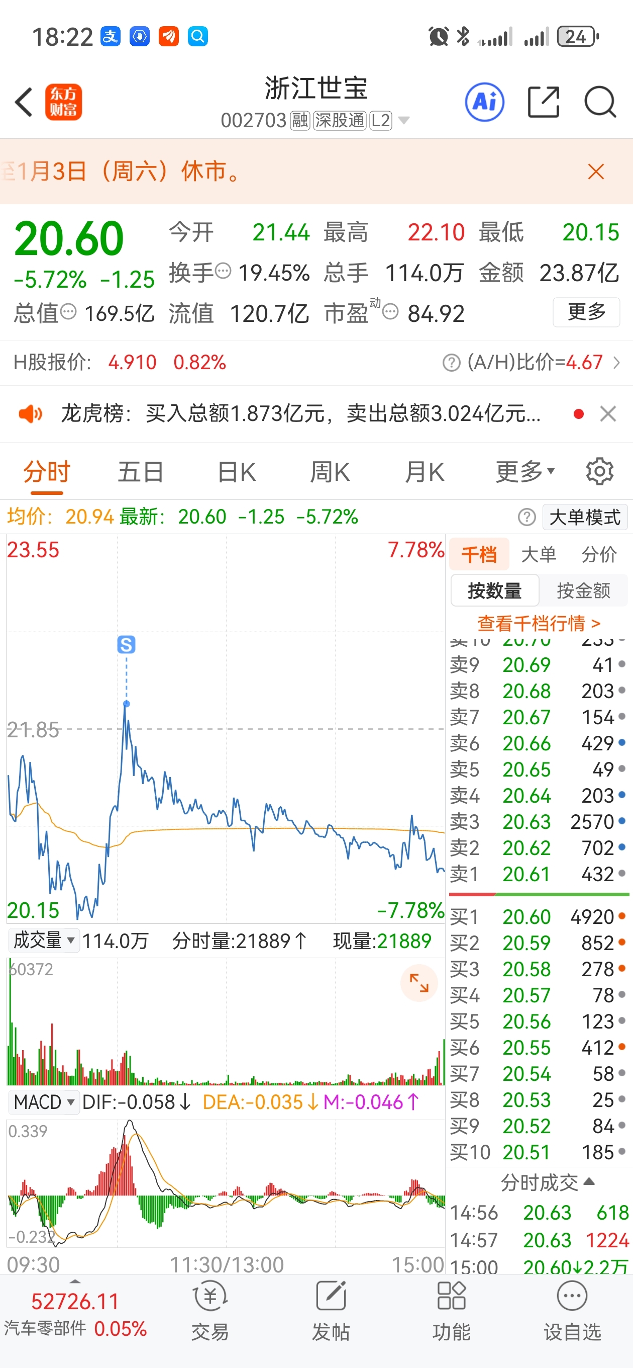 $浙江世宝(SZ002703)$ 昨天跌停板进去的,差点没割了