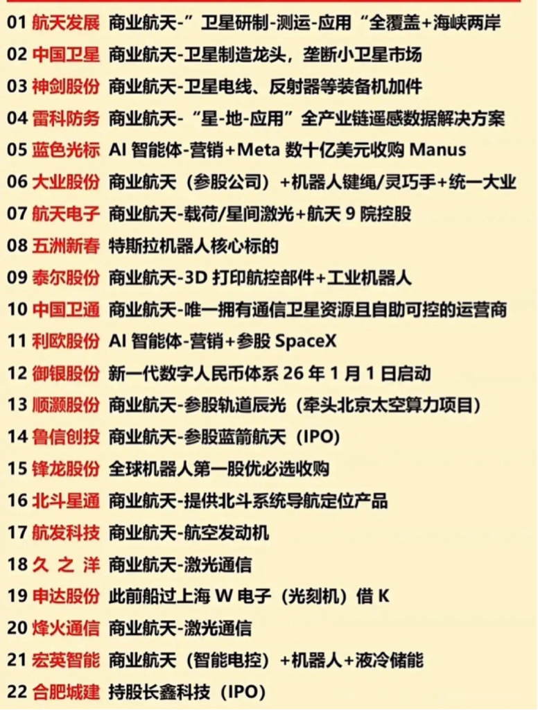 这五大板块覆盖了国家战略发展的关键领域,其中商业航天和机器人代表了高端制造的突破方向,海南板块受益于区域政策红利,AI应用和无人驾驶则是技术变革的前沿阵地。这些个股多为各细分领域的核心参与者,在技术、资源或政策支持上具有显著优势,有望在2026年的行业发展中持续受益。