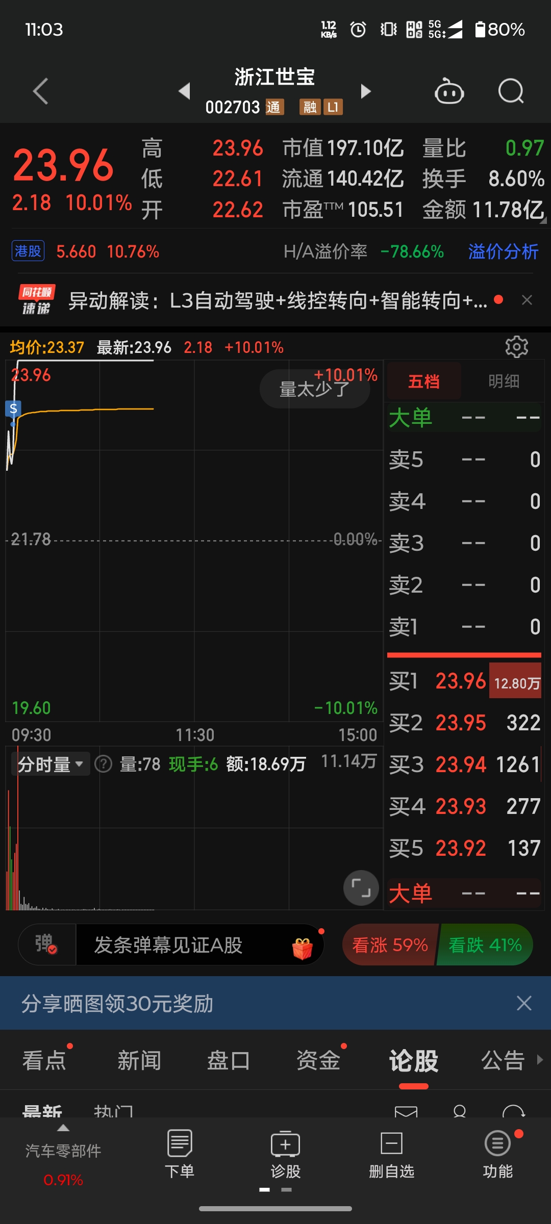 $浙江世宝(SZ002703)$ 昨天打板的,老是炸来炸去,今天就这么强势,涨停了就不给机会,本来想着做个t的,直接卖飞了,换了个杂毛股,虽然也涨停了,但总感觉没啥意思
