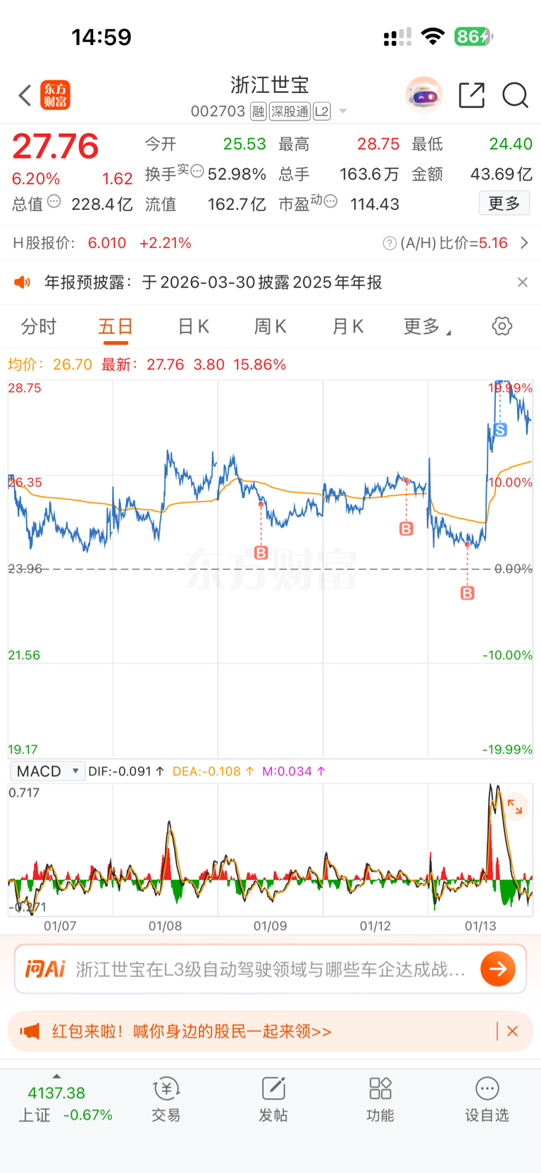 $浙江世宝(SZ002703)$ 虽然看好,还是得做 T 呀,无人驾驶未来是星辰大海!
