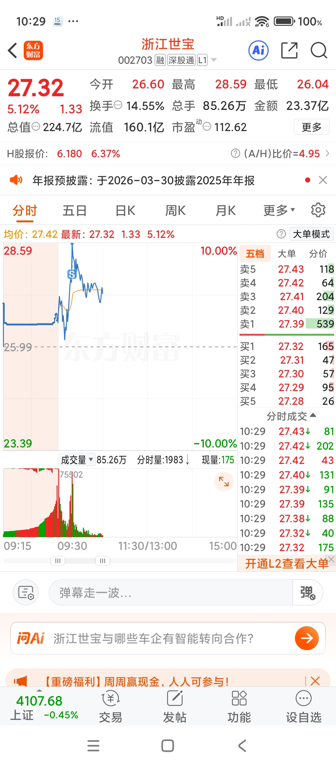 $浙江世宝(SZ002703)$ 就知道封不住,开盘就填了涨停卖出,看看承接,明后天或许再回来!