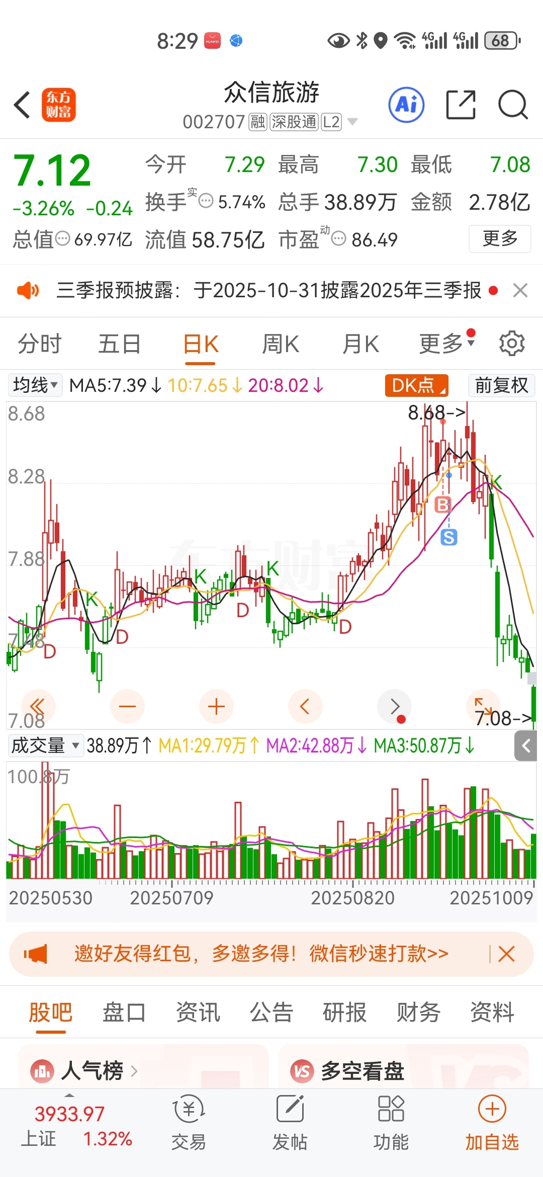 $众信旅游(SZ002707)$ 没有卖飞,吓死人了