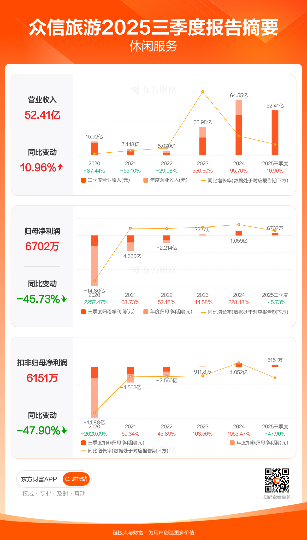 众信旅游10月31日发布2025年三季报显示,公司前三季实现营业收入52.41亿元,同比增长10.96%;归母净利润6701.86万元,同比下滑45.73%;扣非归母净利润6151.46万元,同比下滑47.90%。