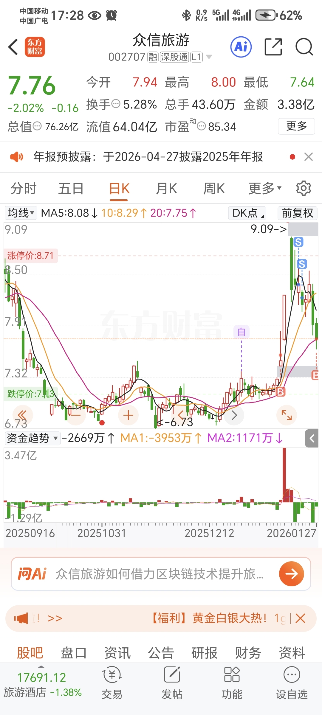 $众信旅游(SZ002707)$ 从遥望赚十个点,又回来了