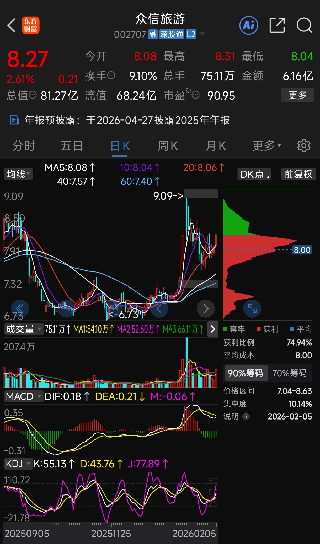 $众信旅游(SZ002707)$ 这两个月来,旅游板块是一个W底后的上涨,这波上涨进展到第4浪常规的调整后,第5浪突破。以2026年的舆论环境看,节前画一个5浪式大浪上涨,节后回调,五一前再拉起来,推进到暑假结束。国庆借利好出货。预计众信旅游从千日最低价算起,最低5倍,最高10倍。