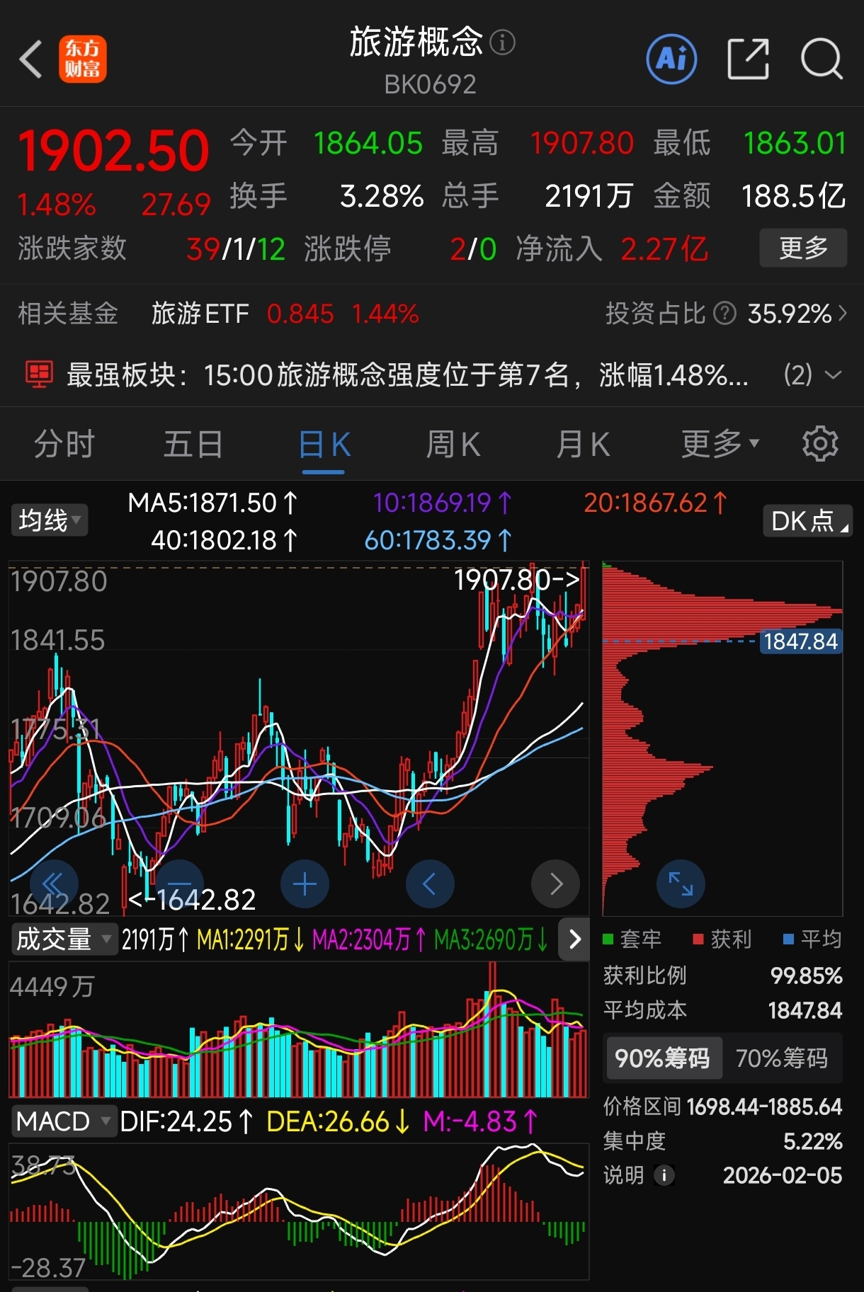 这两个月来,旅游板块是一个W底后的上涨,这波上涨进展到第4浪常规的调整后,第5浪