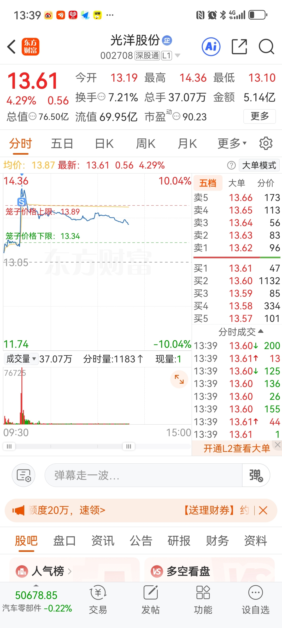 $光洋股份(SZ002708)$ 早盘14.36走人,