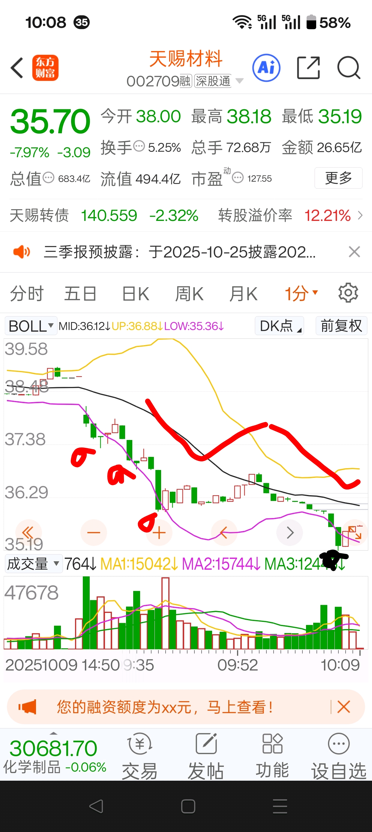$天赐材料(SZ002709)$ 股价第三次触及下轨线,有反弹,目前第二浪下跌第一次触及。今天没有买的价值,做完利空还是好厉害的。手里有,就在跌停附近买。或者明天买。我建议事放弃该股炒作,止损。