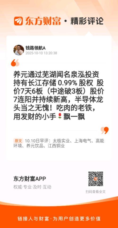 //@钱路领航A :养元通过芜湖闻名泉泓投资持有长江存储 0.99% 股权 股价7天6板(中途破3板)股价7连阳并持续新高,半导体龙头当之无愧!吃肉的老铁,用发财的小手飘一飘 $天赐材料(SZ002709)$$黄河旋风(SH600172)$$金力永磁(SZ300748)$