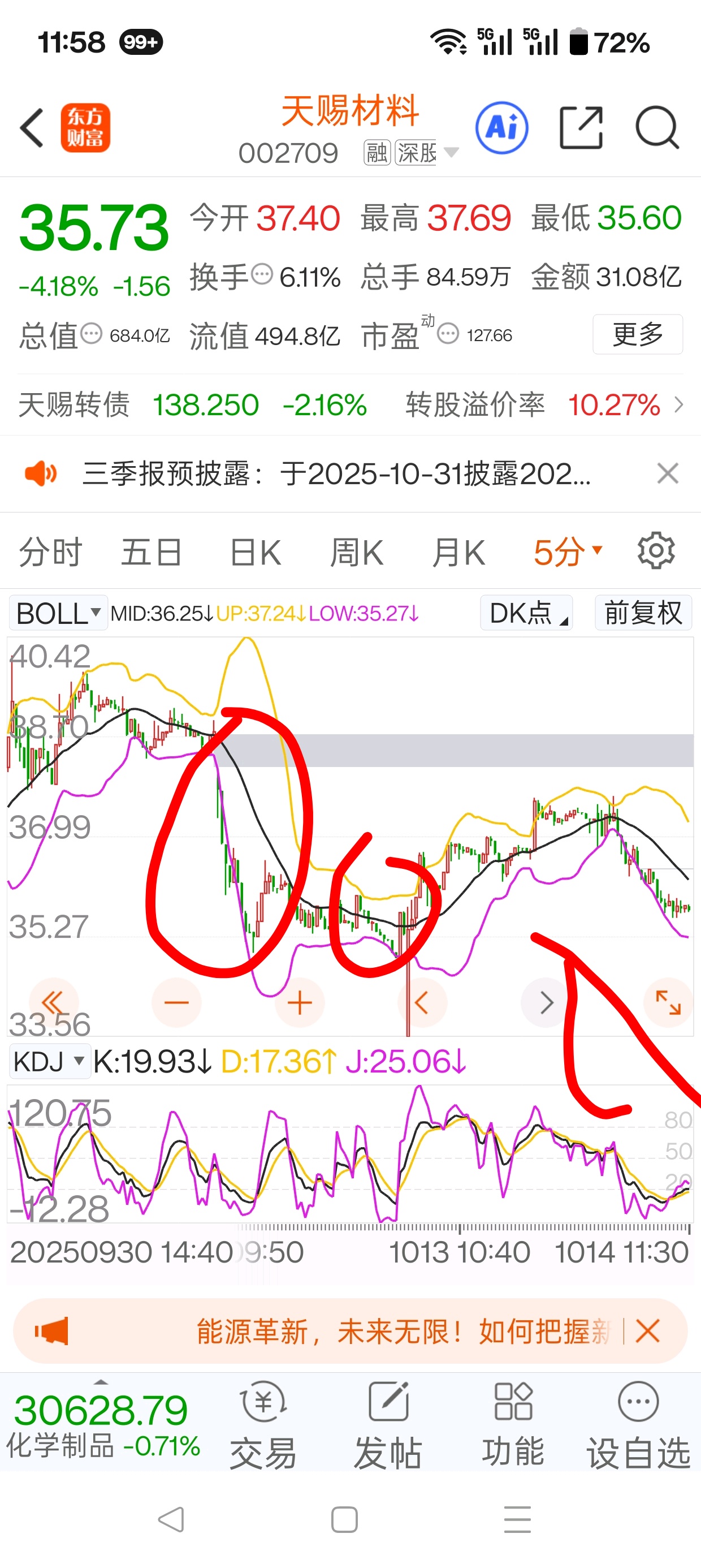 $天赐材料(SZ002709)$ 教大家看盘的方法。下跌以中轨线为基准,走势图下面出现三个眼的时候,股价就跌的差不多了。看图,今天,一个眼还没有构造完,下午继续跌。有反弹到中轨线,立马卖出。图中,右边的眼都没有形成闭环,不跌怎么好看?这样的闭环出现第三个,最好是失败了,那就可以买了。但是,今天的时间不够了,借助于明天早盘速跌后完成造眼图形。