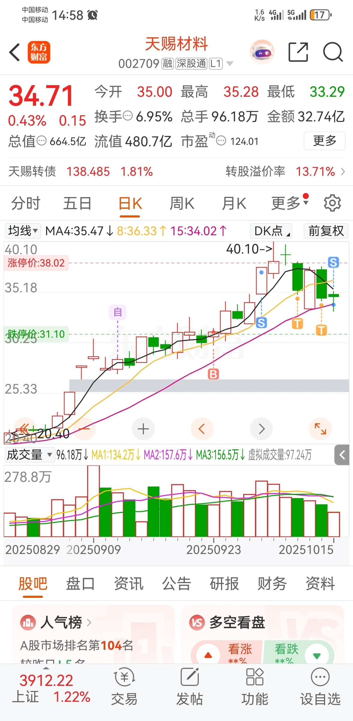 $天赐材料(SZ002709)$ 做了两次T一直相信他是长线,今早卖出后没能接回来,就这样吧当做短线,买了两手本来盘中最高获利一千八,最后实际落袋八百
