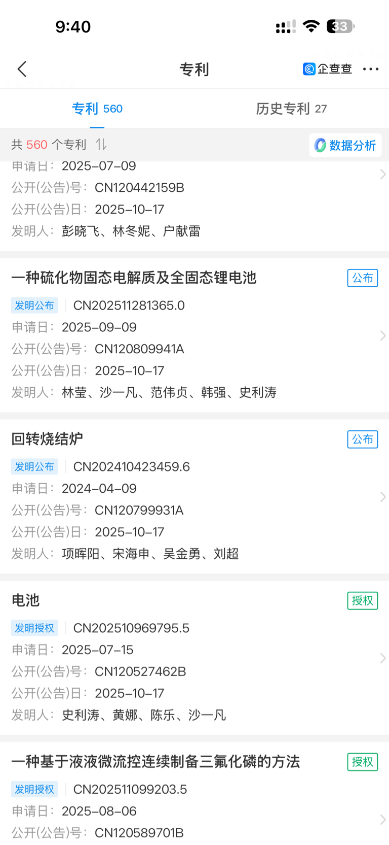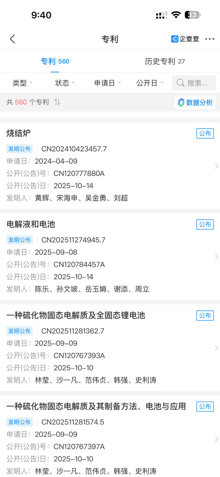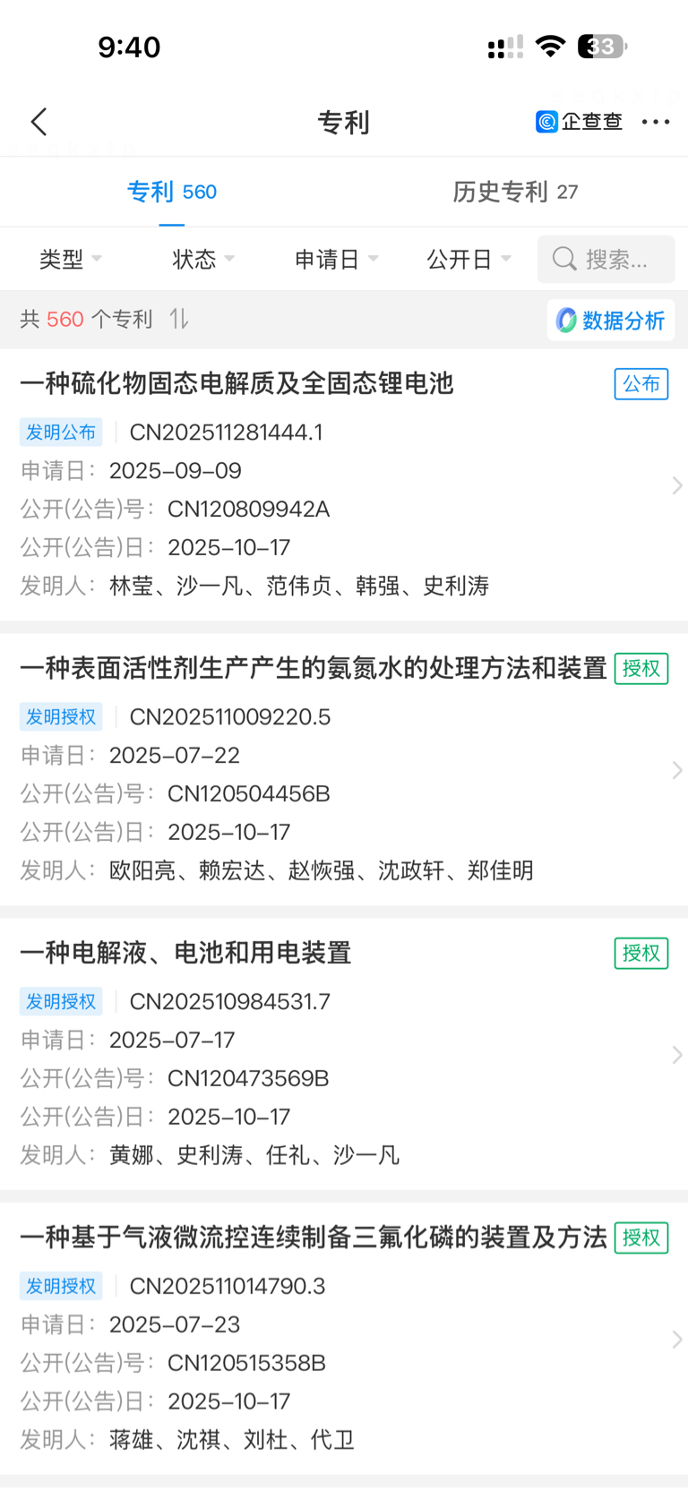 天赐在新能源电池的研发投入是巨大的,成果也显著,在企查查最新公示的专利申请以及授