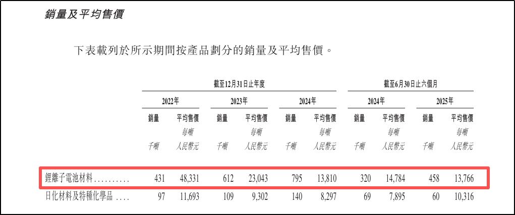 招股说明书显示:自2023年以来,锂离子电池材料的价格持续下滑。2025年上半年平均售价为13766元/吨,不到2022年的1/3。