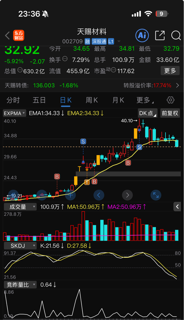 $天赐材料(SZ002709)$ 39.84止跌企稳就接回来