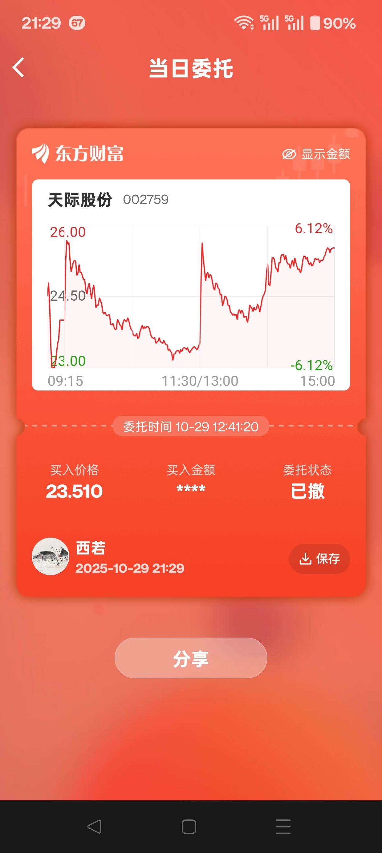 $天赐材料(SZ002709)$ 看好的股票,必须下跌得时候买。等涨起来的时候,很难追到。看看,今天这操作,挂单的时候,都收盘了,我还不知道。今天打工忙一天,抽空看一眼发帖,就是不准确。明天,天赐材料,下跌,今天大家应该总尾市卖出战法卖出,昨天尾市耶应该卖出。。